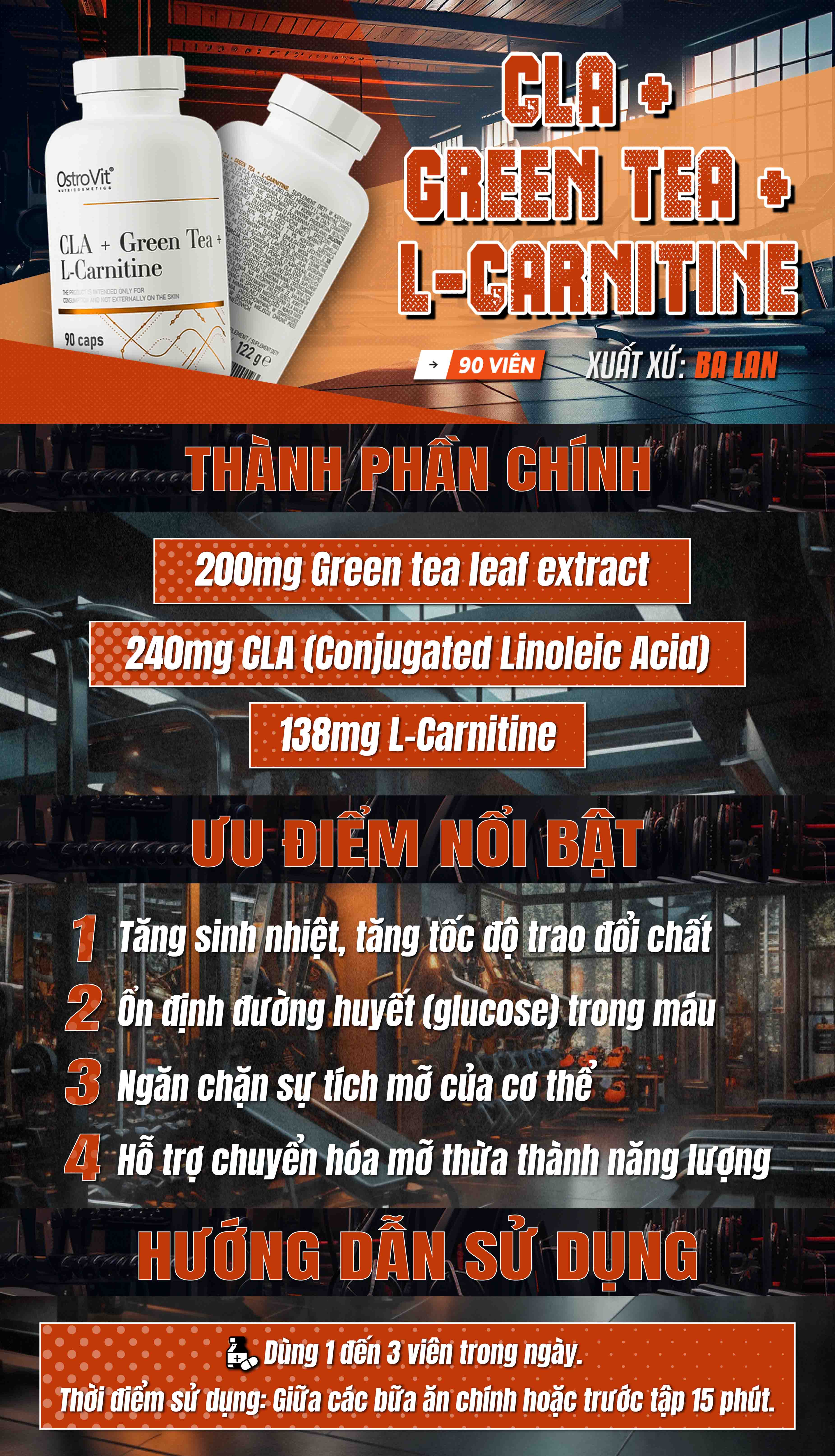 Ostrovit CLA + Green Tea + L-Carnitine là thực phẩm bổ sung dưỡng chất với 3 thành phần chính gồm acid linoleic liên hợp (CLA), chiết xuất từ lá trà xanh và L-carnitine. Sản phẩm giúp giảm cân an toàn, mang lại vóc dáng thon gọn. Viên uống giảm cân không chứa caffeine, không gây mất ngủ cho người dùng. Bên cạnh đó còn có thể thấy được nhiều lợi ích khác về sức khỏe khi sử dụng.