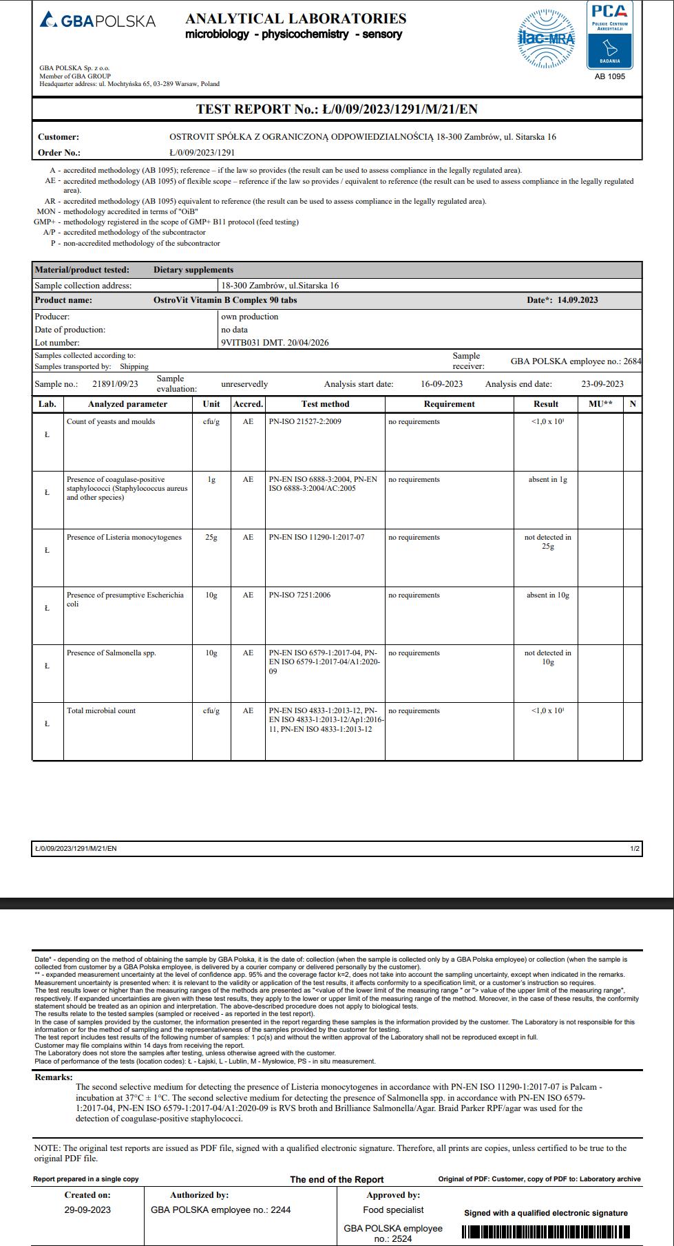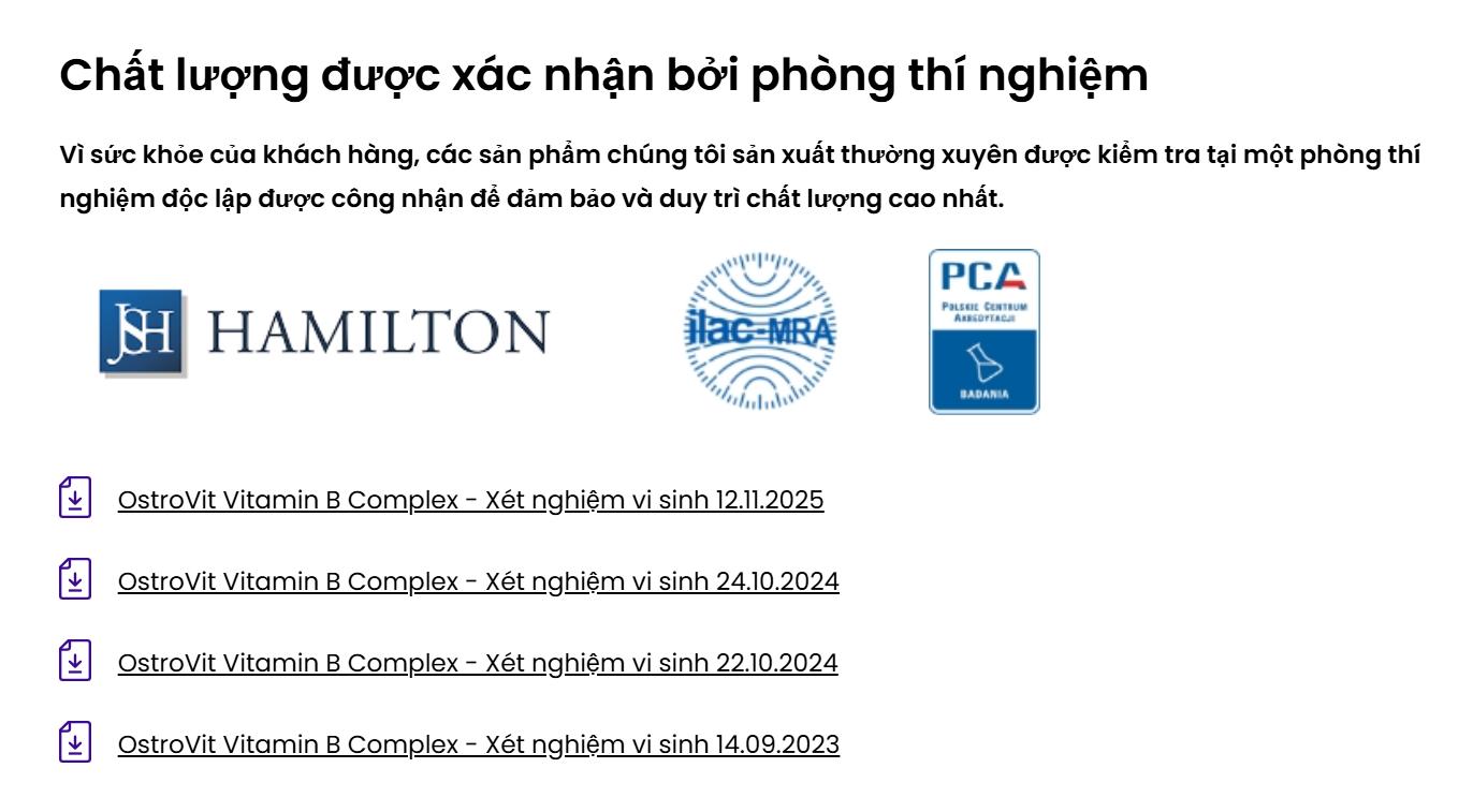 Bảng Dinh Dưỡng Của OstroVit Vitamin B Complex: