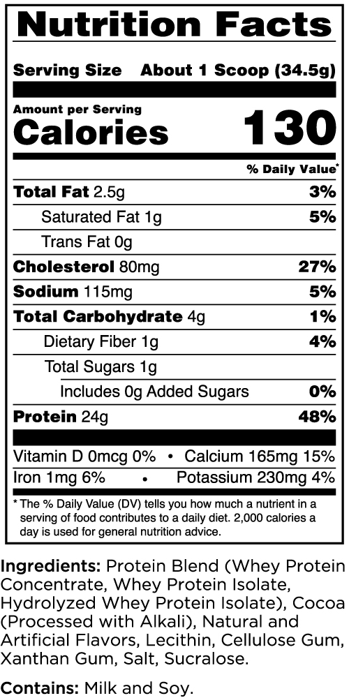 - Hỗn hợp Protein (Whey Protein Cô đặc, Whey Protein Cô lập, Whey Protein Cô lập Thủy phân), Cacao (Chế biến với Kiềm), Hương vị Tự nhiên và Nhân tạo, Lecithin, Xanthan Gum, Cellulose Gum, Muối, Sucralose.